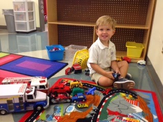 He is in a 2 year old program at USJ with 8 other boys and girls. He gets to learn Spanish, sing music, paint pictures, and even play cars!